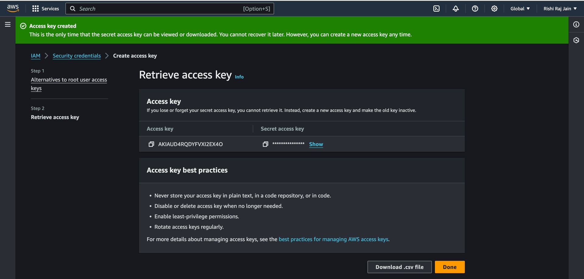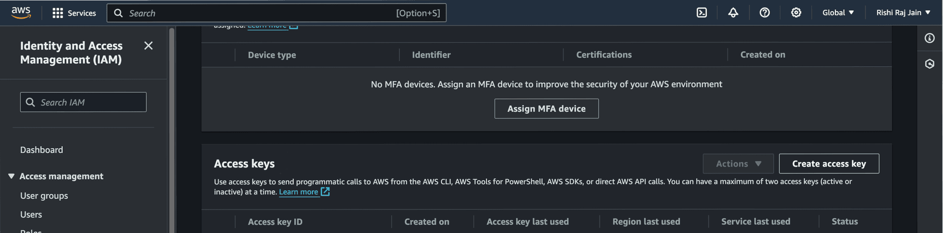 - In the navigation bar in your AWS account, choose your user name, and then choose Security credentials.